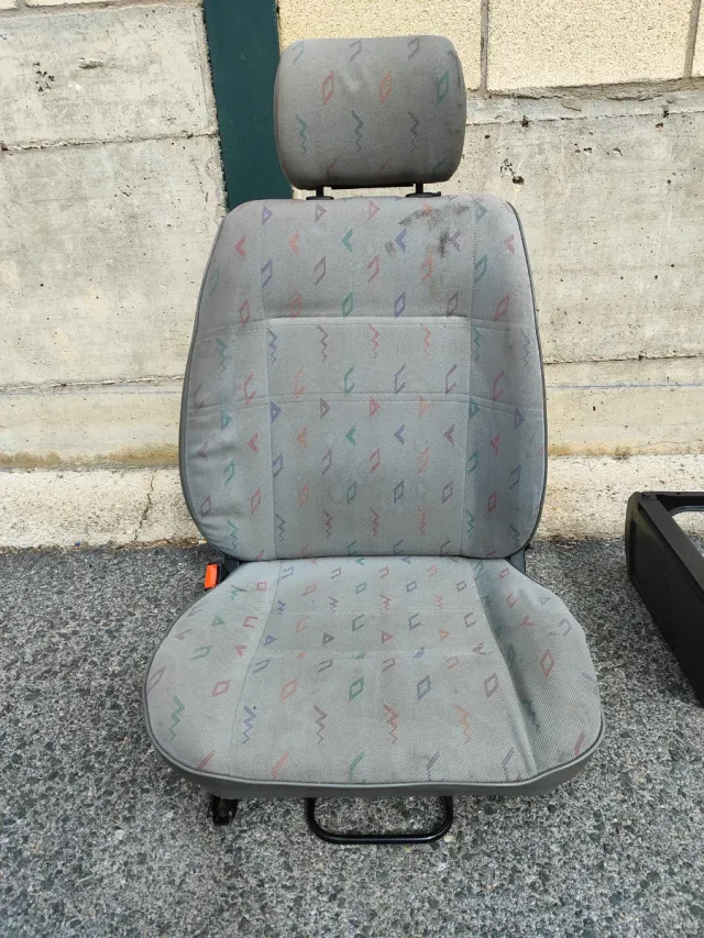 Asiento original de conductor para Volkswagen T4. - Reposacabezas incluido. - Base asiento incluida. El asiento tiene signos de uso y falta la ruleta de reclinar asiento.