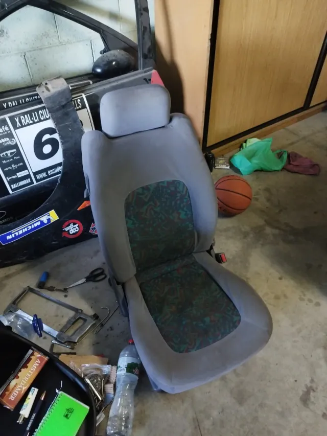 Detalles del productoAsiento de copiloto para Nissan Micra K11 Super S. Tapicería con diseño geométrico en tonos grises, verdes y rojos.