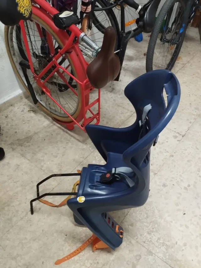Detalles del productoAsiento de seguridad para transportar niños en bicicleta. Es de color azul y cuenta con cinturón de seguridad.