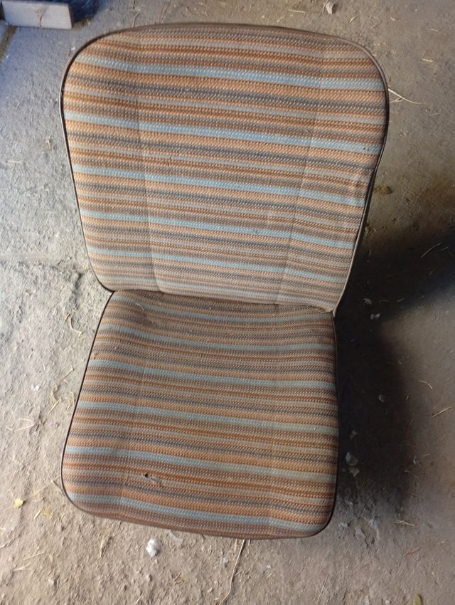 Asiento Renault 4 según se ve en las fotos. Asiento de tela a rayas para Renault 4. - Diseño a rayas en tonos marrones y azules. - Tapicería de tela. - Borde de color oscuro.