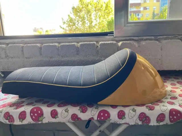 Asiento para moto Royal Enfield 535. - Diseño con acabado en color amarillo y negro. - Ribeteado en color dorado.