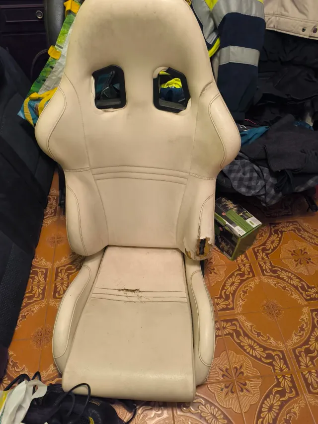 Detalles del productoAsiento deportivo Sparco en color blanco. Presenta desgaste y roturas en el tapizado, visibles en las fotos.