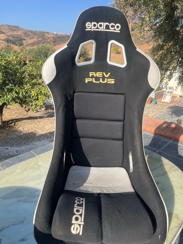 Asiento tipo bucket de la marca Sparco, modelo Rev Plus. - Diseño deportivo. - Tapicería negra y gris. - Logos de Sparco y Rev Plus visibles.