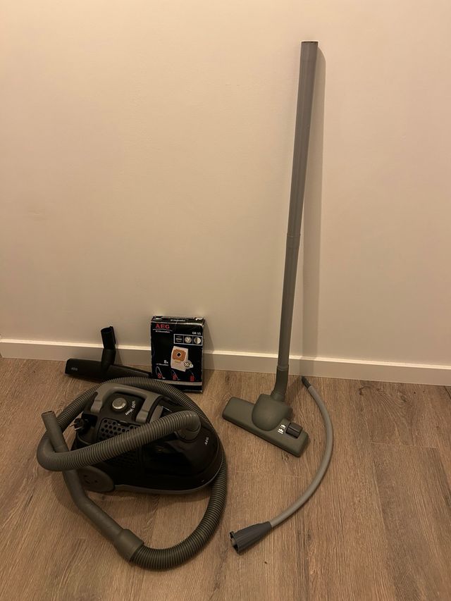 Aspirador AEG de color negro con varios accesorios.