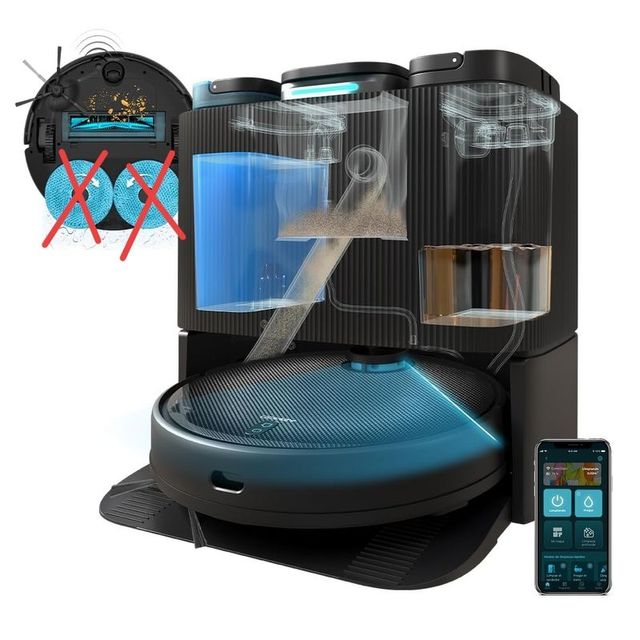 Detalles del productoRobot aspirador Conga 11090 Spin Revolution Home&Wash con base de vaciado automático y sistema de fregado. Incluye estación de autolimpieza, pero NO trae las mopas giratorias (almohadillas). Succión de hasta 5000 Pa, navegación láser ultrasónica y 8 modos de limpieza (auto, bordes, áreas, puntual, espiral, intensiva). Función Total Surface 2.0, retorno y recarga automáticos. Batería de 3200 mAh, autonomía de hasta 140 min. Base con depósitos: polvo 2 L, agua limpia 2,8 L y agua sucia 2,4 L. Compatible con app CECOTEC y asistentes virtuales. Robot: 350×350×97 mm; base: 423×340×568 mm.