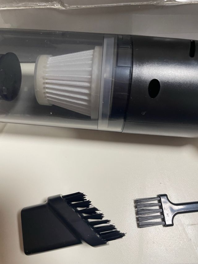 Aspirador de mano portátil con un filtro. - Filtro blanco plisado. - Cuerpo transparente para ver el contenido. - Incluye dos accesorios de cepillo.