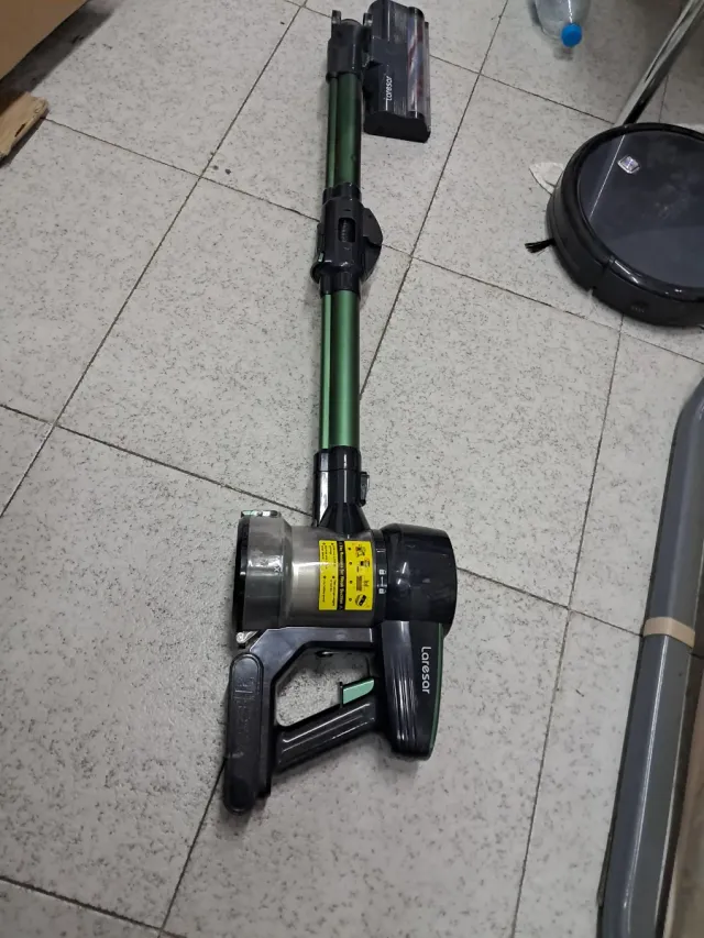 Aspirador escoba de la marca Looresar, con un diseño moderno en color verde y negro. - Tubo extensible. - Mango ergonómico. - Batería recargable.