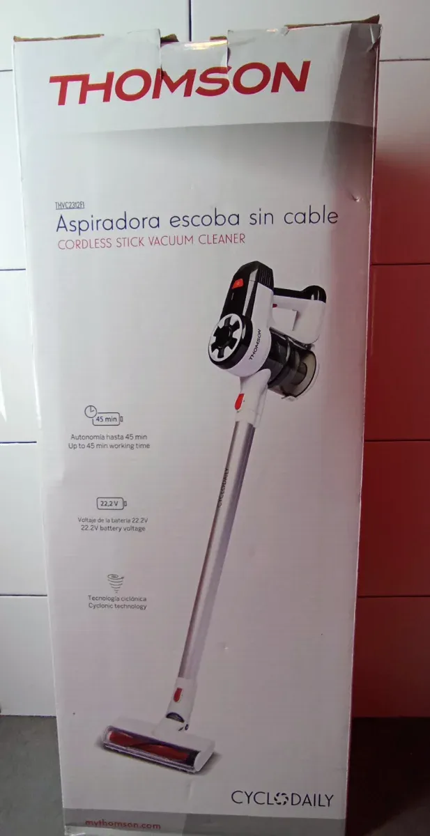 Detalles del productoAspirador escoba Thomson en color blanco y negro. Es un modelo sin cable, ideal para una limpieza cómoda y versátil.