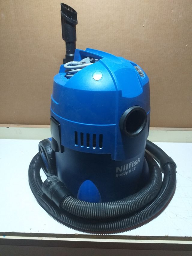 Aspirador Nilfisk Buddy II 12 en color azul. - Incluye manguera y cepillo. - Diseño compacto y funcional.