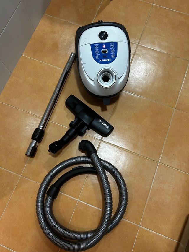 Aspirador Nilfisk One en color blanco. Incluye todos los accesorios. - Manguera flexible. - Tubo de aspiración. - Cepillo. - Cuerpo principal del aspirador.