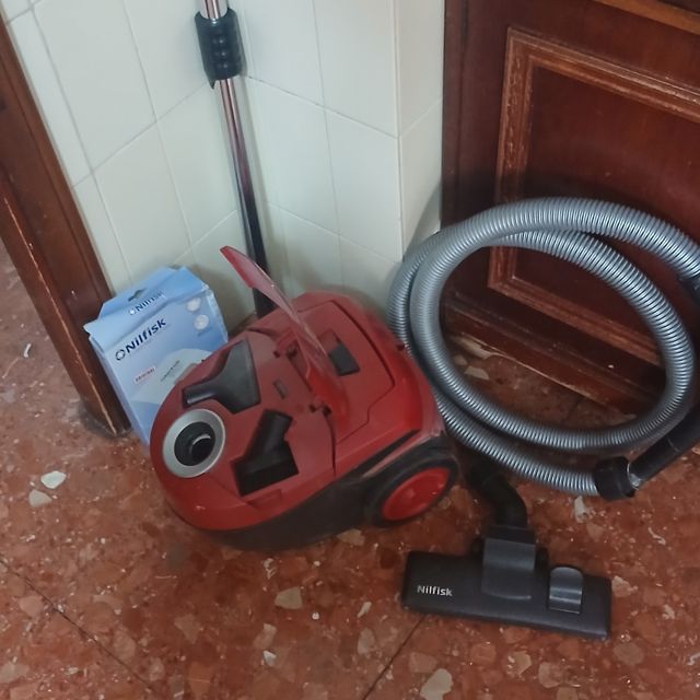 Detalles del productoAspirador Nilfisk de color rojo, con manguera y cepillo.