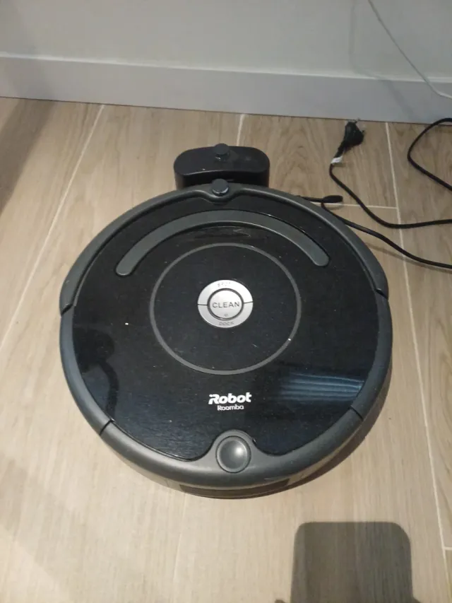 Aspirador robot Roomba en color negro. - Diseño redondo. - Botón central 'Clean'. - Base de carga incluida.