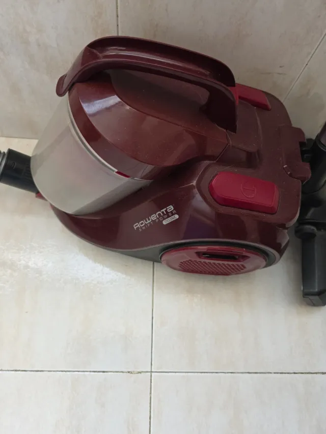 Aspirador de la marca Rowenta en color rojo. - Diseño compacto y ligero. - Asa para facilitar el transporte. - Depósito extraíble para vaciado sencillo.