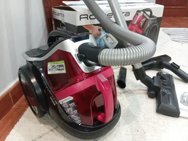 Detalles del productoAspirador Rowenta en color rojo y negro, con un diseño moderno y eficiente.