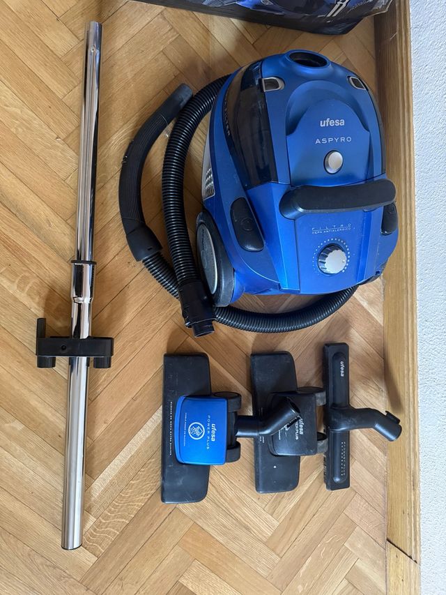 Detalles del productoAspirador Ufesa Aspiro en color azul, con varios accesorios para una limpieza completa.