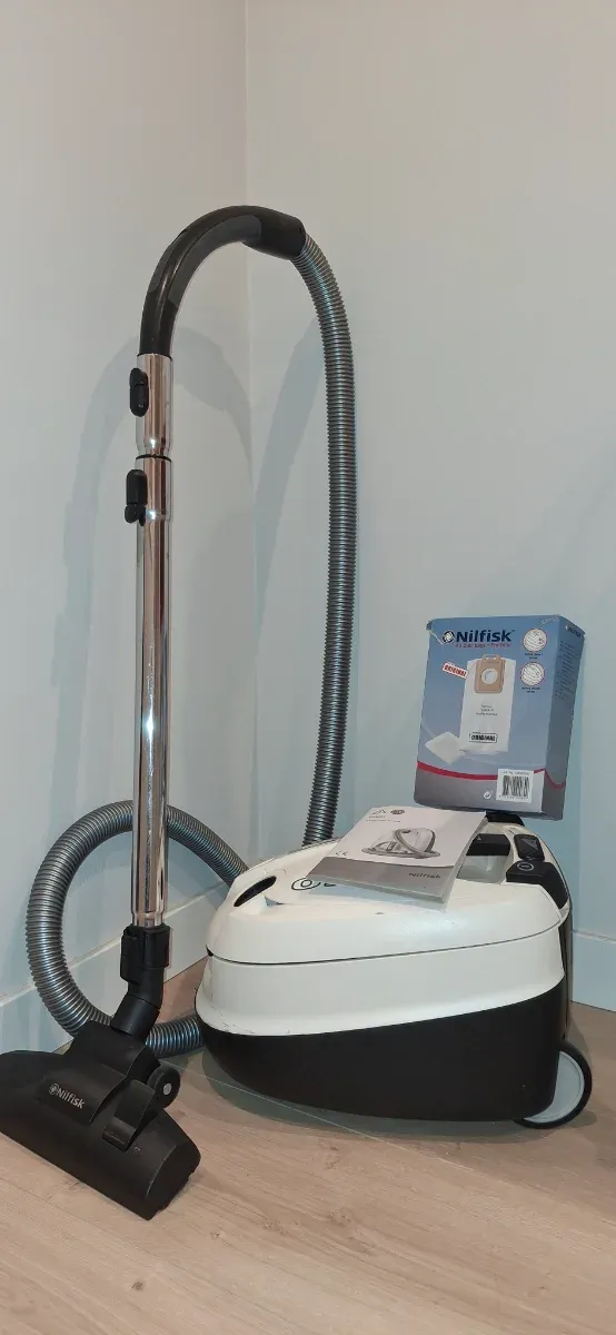 Detalles del productoAspiradora Nilfisk en color blanco y negro. con bolsas y manuales.