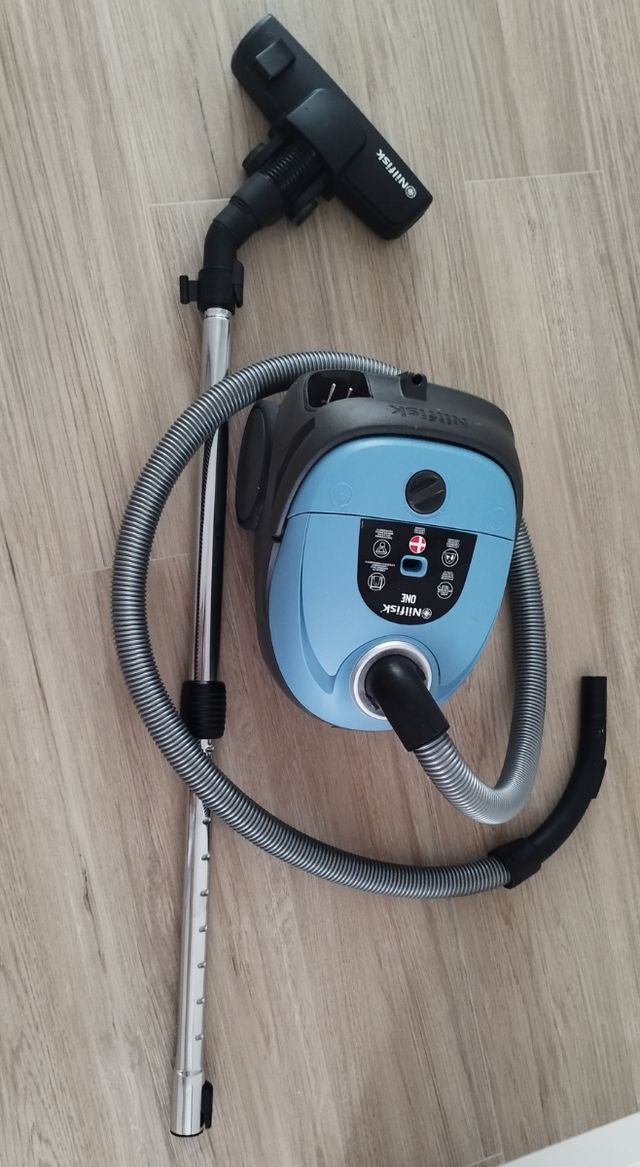 Detalles del productoAspiradora Nilfisk One de color azul. Compacta y fácil de manejar.