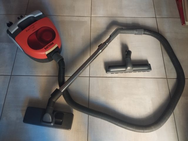 Aspiradora Philips con tecnología ciclónica, diseñada para una limpieza eficiente. - Modelo sin bolsa. - Color rojo y gris. - Incluye tubo y cepillo.