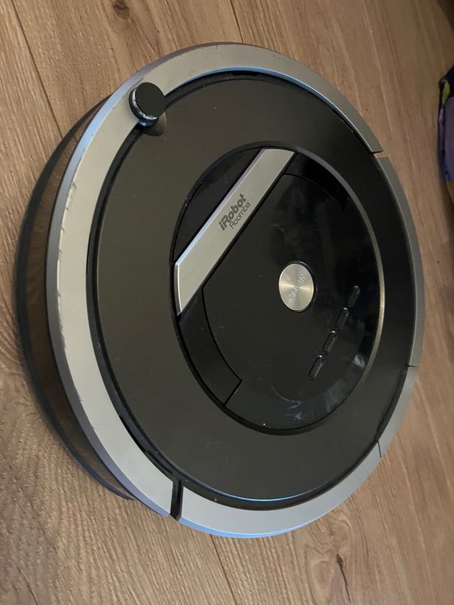 Aspiradora robot iRobot Roomba. - Diseño redondo y compacto. - Color negro con detalles plateados. - Botón de inicio en la parte superior.