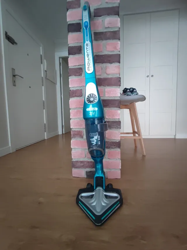 Detalles del productoAspiradora escoba Rowenta Air Force Extreme Lithium de color azul y gris. Se ve de con filtro de recambio, cargador y guía de usuario