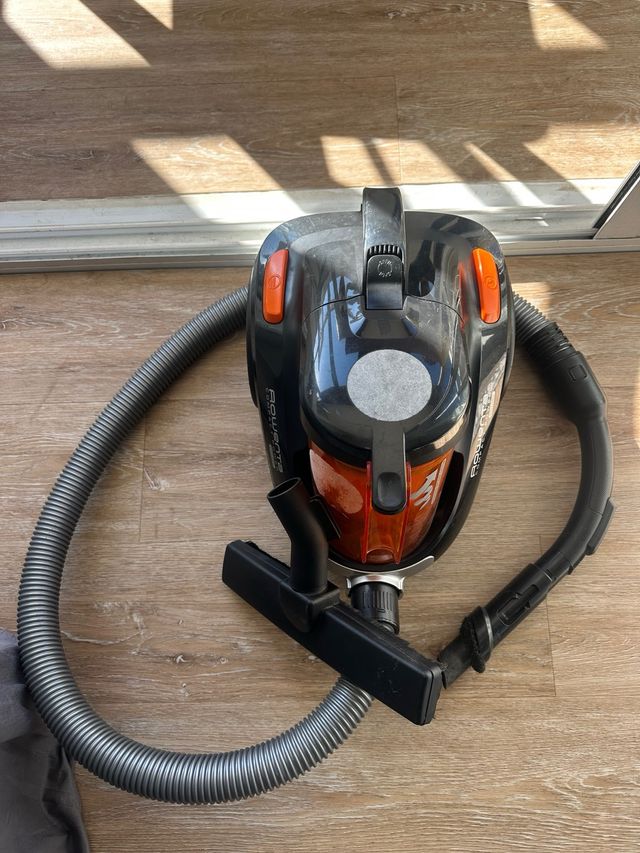 Detalles del productoAspiradora Rowenta Compact Power Cyclonic en color negro y naranja. Diseñada para una limpieza eficiente y sin bolsa.