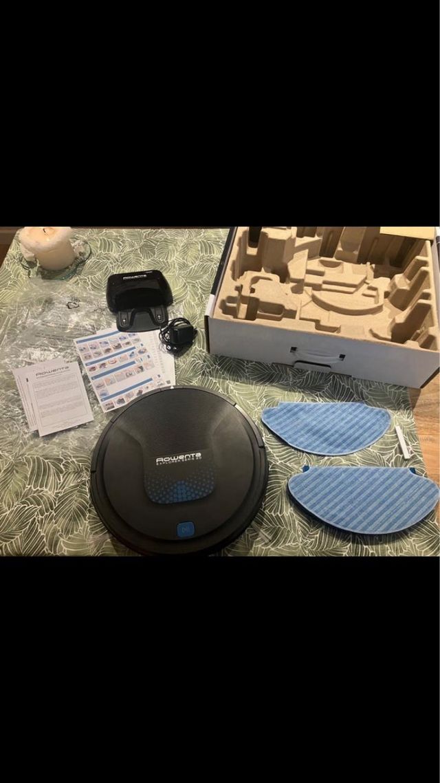 Aspiradora robot Rowenta, ideal para mantener tu hogar limpio. - Incluye base de carga. - Dos paños de limpieza. - Manual de instrucciones