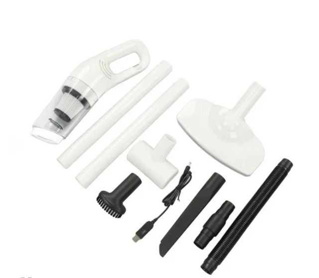 Detalles del productoAspiradora portátil de color blanco con varios accesorios para una limpieza versátil.