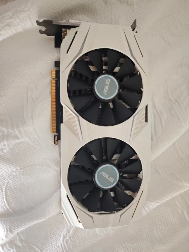 Detalles del productoTarjeta gráfica ASUS DUAL GTX 1060 con 6GB de memoria VRAM. Diseñada con un acabado blanco y dos ventiladores para una refrigeración eficiente.