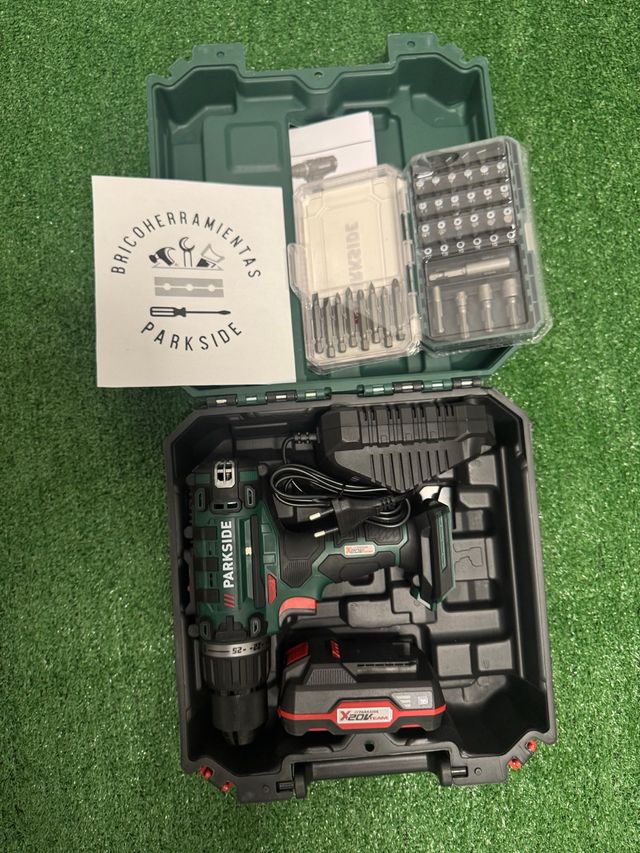 Detalles del productoAtornillador Parkside de 20V con estuche de puntas, batería y cargador.