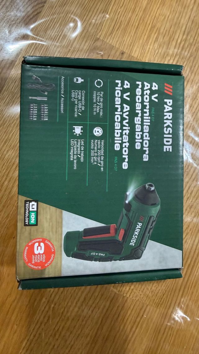 Detalles del productoAtornillador eléctrico Parkside de 4V, modelo PAS 4 D7, con batería recargable.