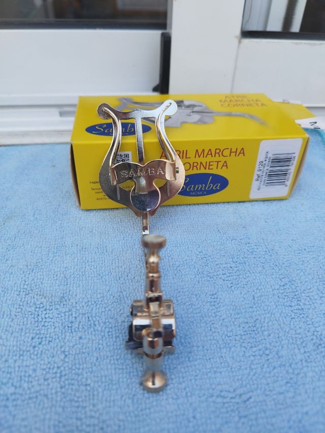 Detalles del productoAtril para cornetas, color dorado, de la marca Samba. Está en perfecto estado.
