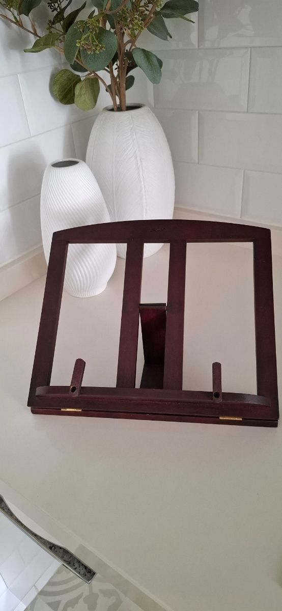 Detalles del productoAtril de madera para libros o tabletas. Ideal para leer cómodamente. - Fabricado en madera oscura, de aspecto elegante y resistente. - Diseño plegable para facilitar su almacenamiento. - Dos soportes para sujetar el libro o la tableta de forma segura.