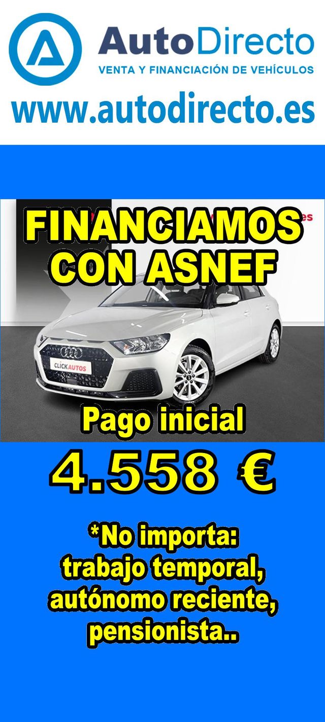 Detalles del producto¿No consigues financiación? ¡Tenemos la solución! *************************************************************************** RENT CREDIT: Aprobamos más del 90% de las operaciones. No importa ASNEF o RAI, impagos pendientes, ser autónomo o empresa reciente, ser pensionista. Imprescindible pago inicial del 20%. Ejemplo de operación: AUDI A1 SPORTBACK 30 TFSI 110CV ADVANCED STRONIC. Ref. W956345MFB - Precio vehículo financiado: 22790 €. - Pago inicial de 4558 €. - Cuota mes desde 474 €. - Impuesto de circulación y garantía (mínimo 1 año) incluidos. *************************************************************************** ✅ Más de 3.000 COCHES Y FURGONETAS EN STOCK. ✅ HASTA 2 AÑOS DE GARANTIA. ✅ Kilómetros certificados. ✅ 17 concesionarios repartidos en toda España. ♻️ Aceptamos tu coche como parte del pago. *************************************************************************** IMPORTANTE: -. Este anuncio, no es vinculante, puede contener errores. SE MUESTRAN A TÍTULO INFORMATIVO Y NO CONTRACTUAL. -. Consultar disponibilidad del vehículo y datos exactos: fecha de matriculación, importes, etc,... *************************************************************************** Te ofrecemos distintas opciones: financiación, renting, alquiler con opción a compra, rent credit. En nuestro stock disponible encontraras: 3008 , qashqai , corolla , rav4 , sandero , Duster , yaris , 2008 , Tucson , Ibiza , 208 , Sportage , a3 , c4 , Formentor , q3 , yaris cross , 500 , c3 , arona , zs , x1 , kona , corsa , clase a , león , 308 , serie 1 , golf , focus , captur , a1 , tiguan , i20 , t roc , stonic , xc40 , civic , q5 , serie 3 , glb , 5008 , ateca , clio , kuga , c hr , i30 , arkana , juke , a4 , x3 , cx 5 , xc60 , kamiq , taigo , Mustang , x6 , polo , ceed , karoq , x2 , Astra , niro , cx 30 , a5 , cooper , megane , moka , fiesta , hs , q2 , clase c , serie 3 , renegade , picanto.
