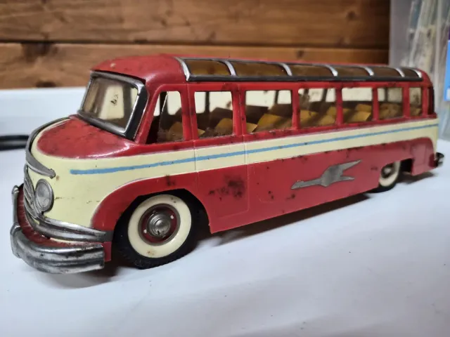 Detalles del productoAutobús Payá Studebaker de los años 50. Mecanismo de cuerda activo: al darle cuerda el motor gira sin problema. En el suelo necesita ajuste: según la posición avanza poco o tiende a retroceder, probablemente por el desgaste de ruedas y un pequeño desajuste del trinquete/cambio, típico de estos modelos y fácil de revisar por un experto. Carrocería original con óxido superficial. Ideal para coleccionistas o restauración ligera. Se entrega sin llave.