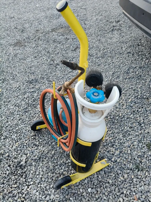 Autogena con arro para transportar botellas de gas, ideal para equipos de soldadura. - Estructura metálica amarilla. - Ruedas para facilitar el movimiento. - Soporte para mangueras.