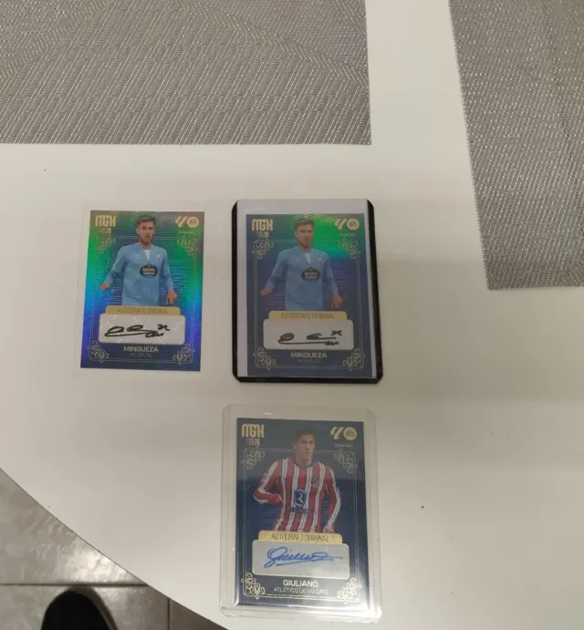 Detalles del producto3 Autografos autos firmados con la firma de Giuliano Simeone y Mingueza de megacracks 2025/2026 25 26 2025 2026 de panini. De los sobres a las fundas. Ambos por 300€.