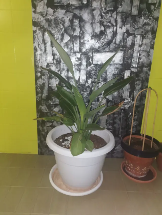 Planta de interior Ave del paraíso. -Altura maxima 1.8 m - Hojas verdes y alargadas. - Maceta blanca incluida. -Florece una flor naranja .