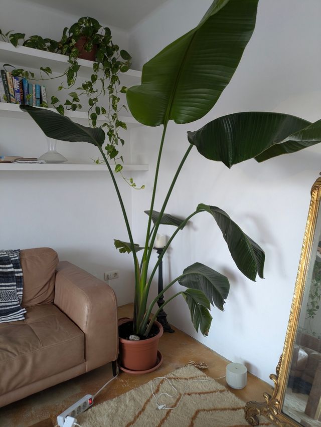 Detalles del productoPlanta de Ave del Paraíso en maceta. Es una planta grande y vistosa, ideal para decorar cualquier espacio.