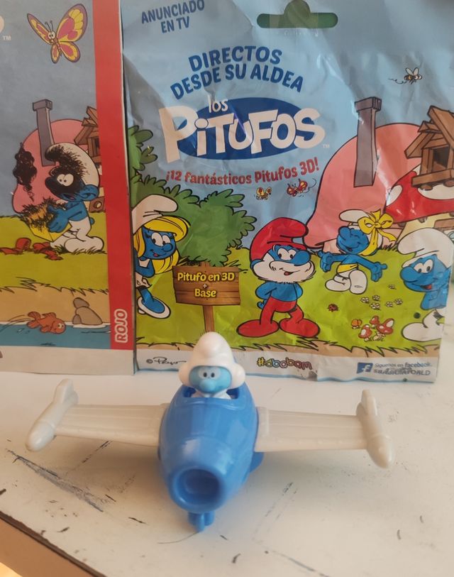 Pitufo piloto en su avión Kinder Maxi. Ideal para coleccionistas. - Figura de plástico. - Avión azul y blanco. - Pitufo con gorro blanco.