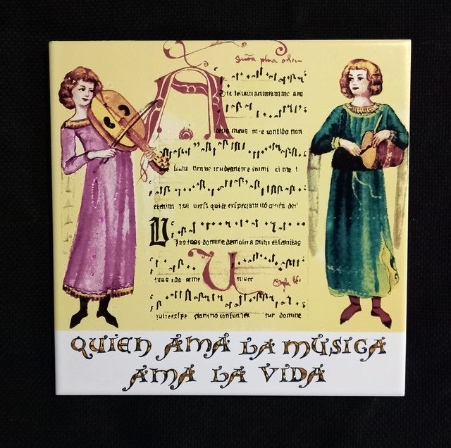 Detalles del productoAzulejo cerámico de tamaño 20x20 con la cita Quien ama la música ama la vida junto a la imagen de dos músicos medivales y una reproducción de la primera partitura que se compuso. Baldosin cocido, imagen indeleble, dispone de colgador. Se hacen envíos y lotes. Entrega en mano en Ávila capital. Más cuadros, azulejos y artículos de decoración sobre la música y de temática medieval en mi perfil.
