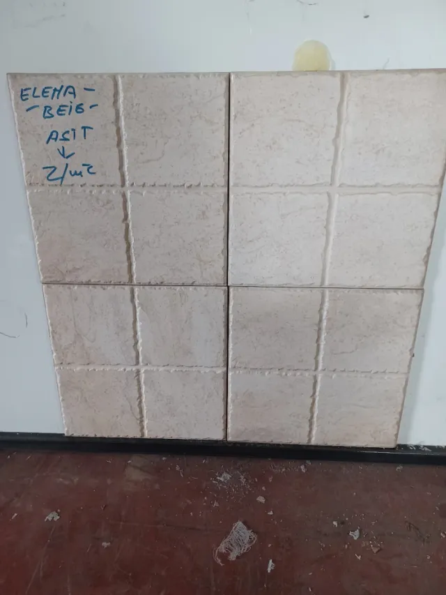 Detalles del productoAzulejos de cerámica en color beige, con un diseño que imita la piedra. Son ideales para revestir paredes.
