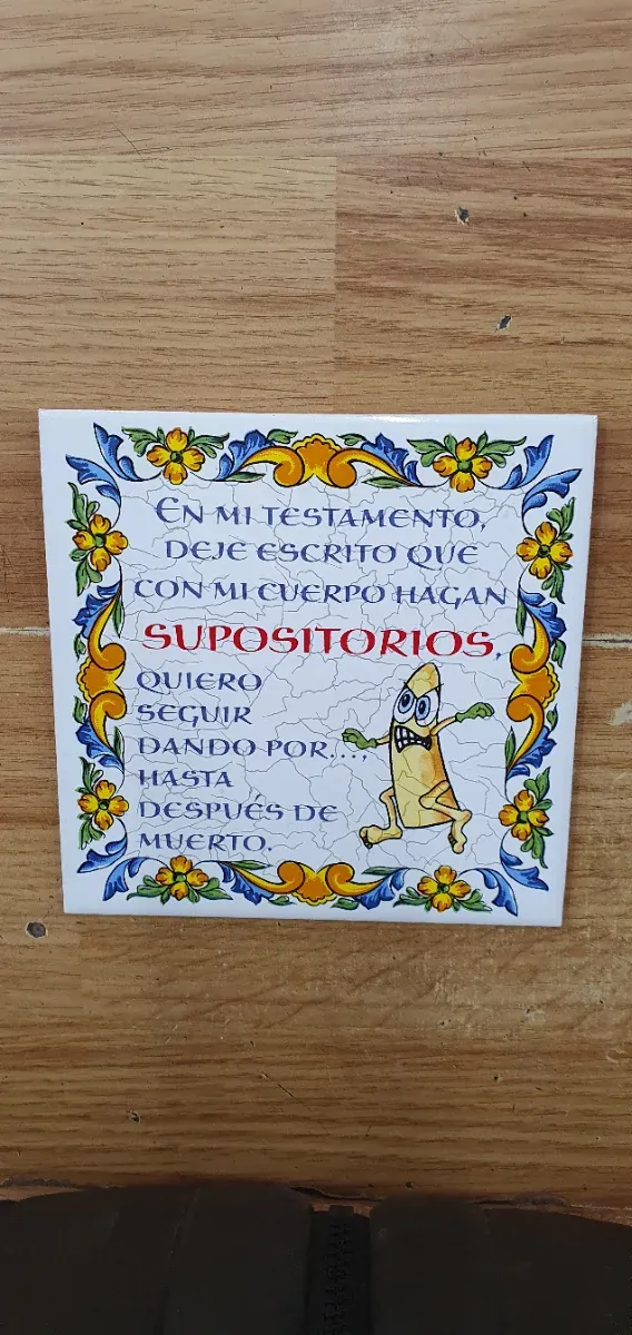 Azulejo decorativo con un refrán divertido y un dibujo de un supositorio. - Diseño original. - Marco decorativo con motivos florales. - Texto en español.