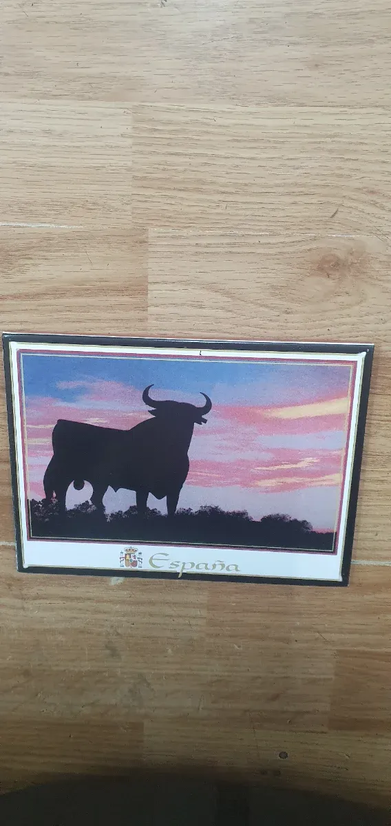 Bonito azulejo decorativo con la imagen de un toro y el texto España. - Diseño de toro al atardecer. - Borde decorativo.