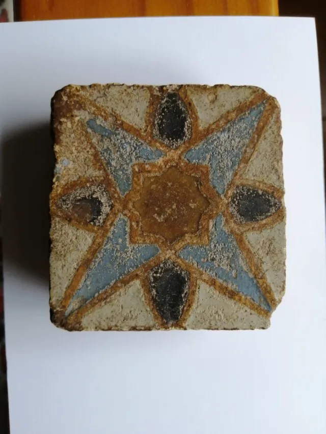 Detalles del productoPieza de azulejo mudéjar, también conocida como olambrilla, datada entre los siglos XV y XVI. Presenta un diseño geométrico con motivos estrellados y colores tierra, azul y negro.