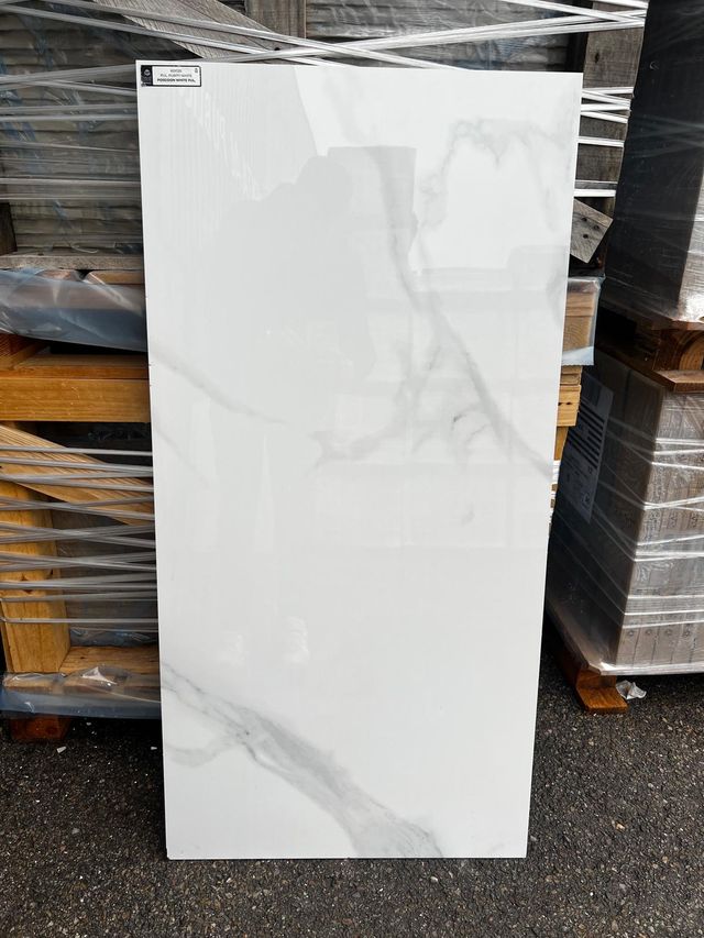 Azulejo porcelánico con un diseño elegante que imita el mármol. - Acabado brillante. - Diseño veteado en tonos grises.