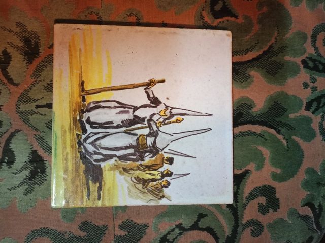 Azulejo artesanal con diseño típico de Triana, Sevilla. Representa una escena con figuras. - Motivo decorativo tradicional. - Colores vivos y trazos definidos.