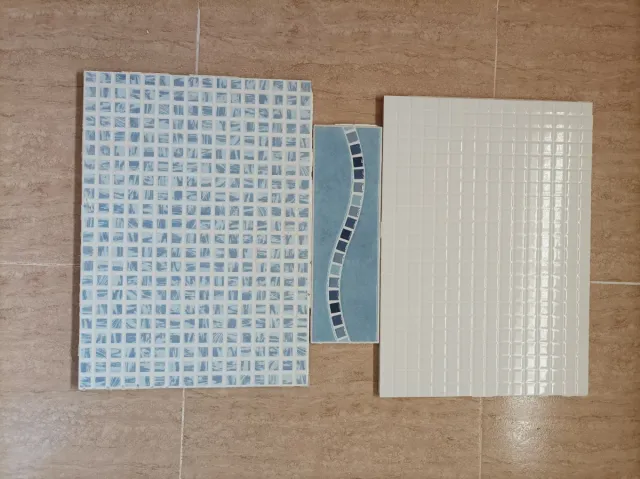 Detalles del productoLote de azulejos y una cenefa decorativa con diseño ondulado.
