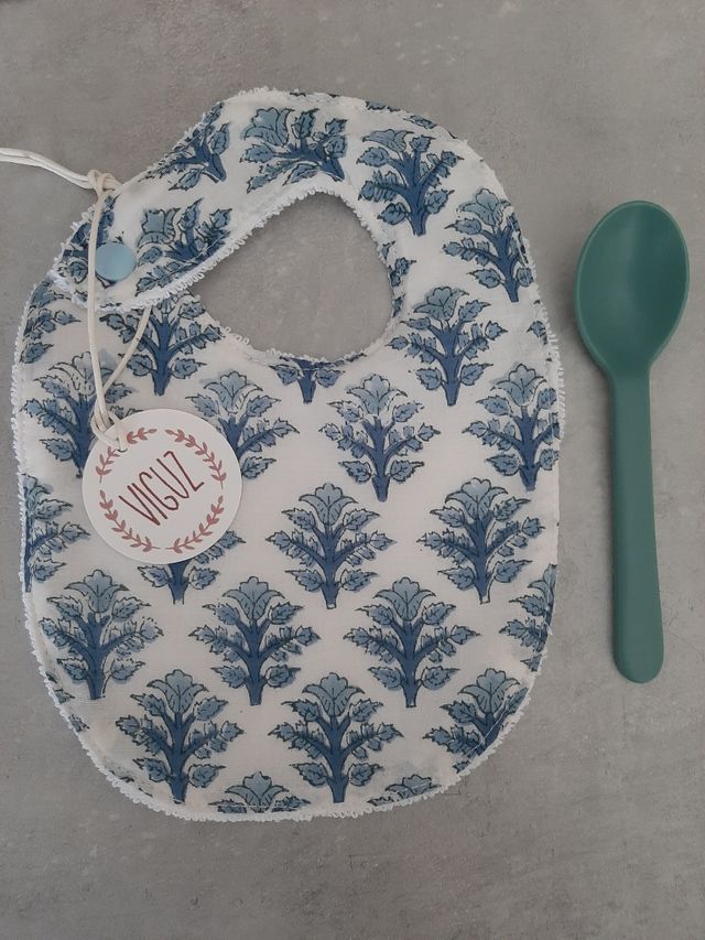 Detalles del productoBabero bebé talla 0-3 meses con estampado flor India azul y rizo blanco. Confeccionado artesanalmente en algodón 100% Ideal para regalar a esa persona tan especial. Unisex 🩷
