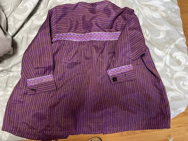 Detalles del productoBabero de talla 1 con un diseño de rayas moradas y doradas. Presenta detalles bordados en zigzag en el pecho y los puños.