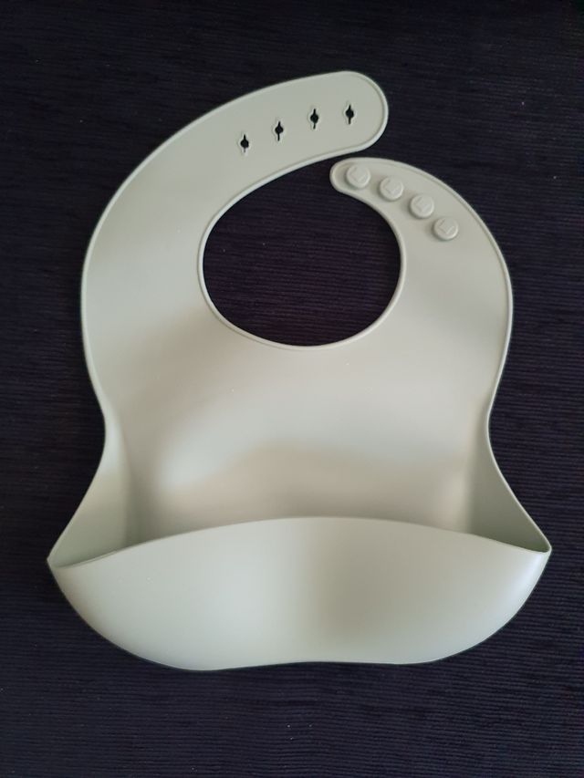 Babero de silicona para bebé, color verde claro. - Material de silicona suave y flexible. - Diseño práctico con recogedor de comida. - Fácil de limpiar. - Nuevo, sin usar.